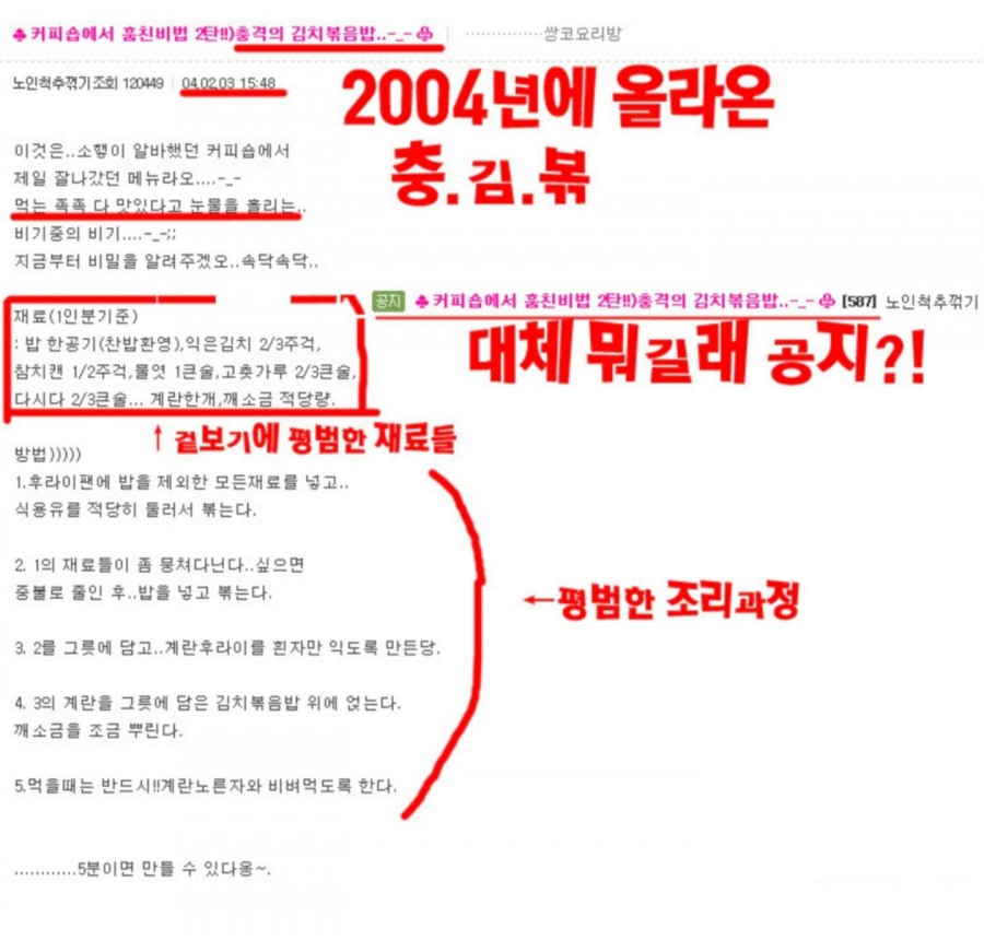 2004년에 한 커뮤니티 게시판에 충격의 김치볶음밥이라는 이름으로 올라온 게시판의 레시피가 아직도 김치볶음밥 레시피의 전설처럼 남겨져 있습니다. 얼마전 박나래씨가 방송에서 언급을 한 이후로 다시 한 번 화제가 됐었죠.